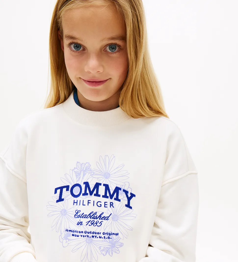 Elegant Tommy Hilfiger sweatshirt i hvid med et print på fronten af blå blomster og et stort logo. Sweatshirten har en rund halsudskæring og lange ærmer med brede ribkanter ved alle åbninger.