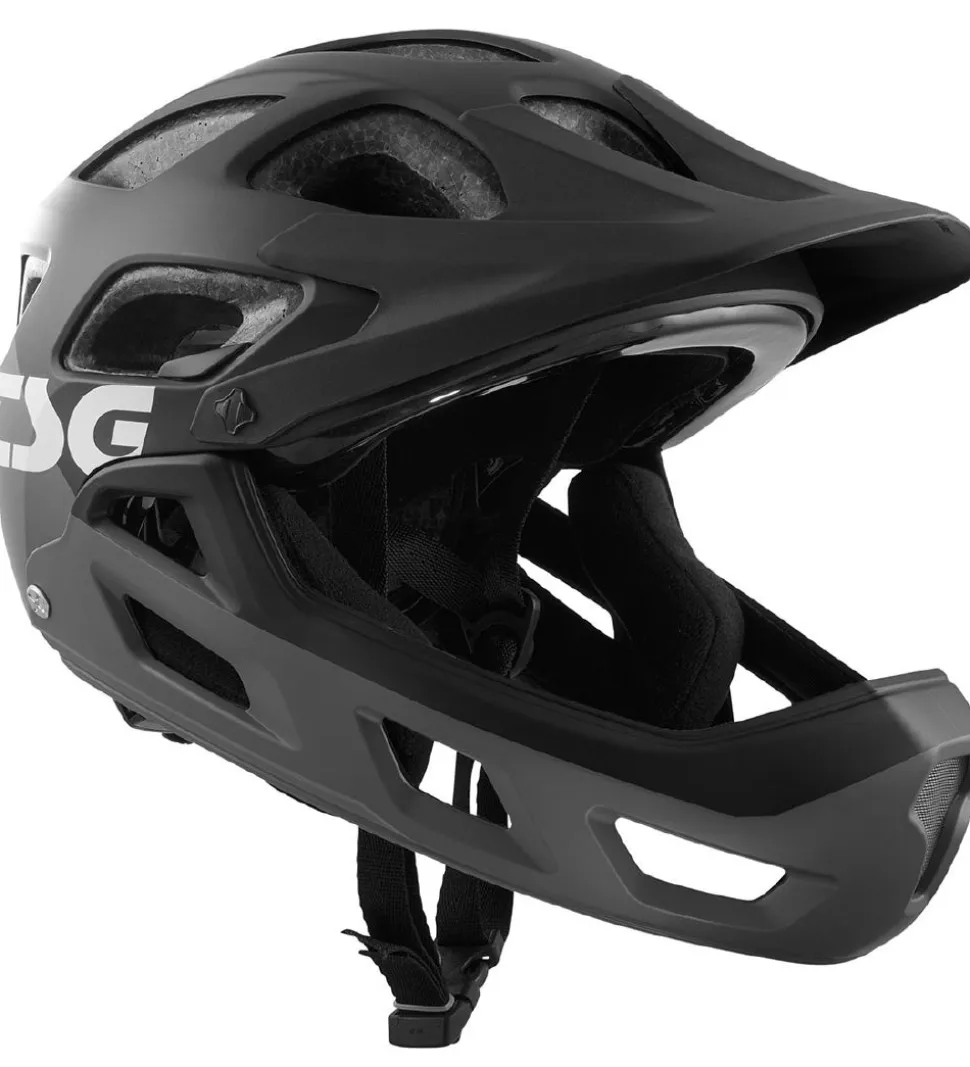 TSG mountainbikehjelmen spændes under hagen med justerbare remme med en klikspænde. Mountainbikehjelmen kan spændes til i nakken med en drejespænde. Hjelmen har gode lufthuller i toppen, og indvendigt er der bløde fleecepuder så den føles behagelig.