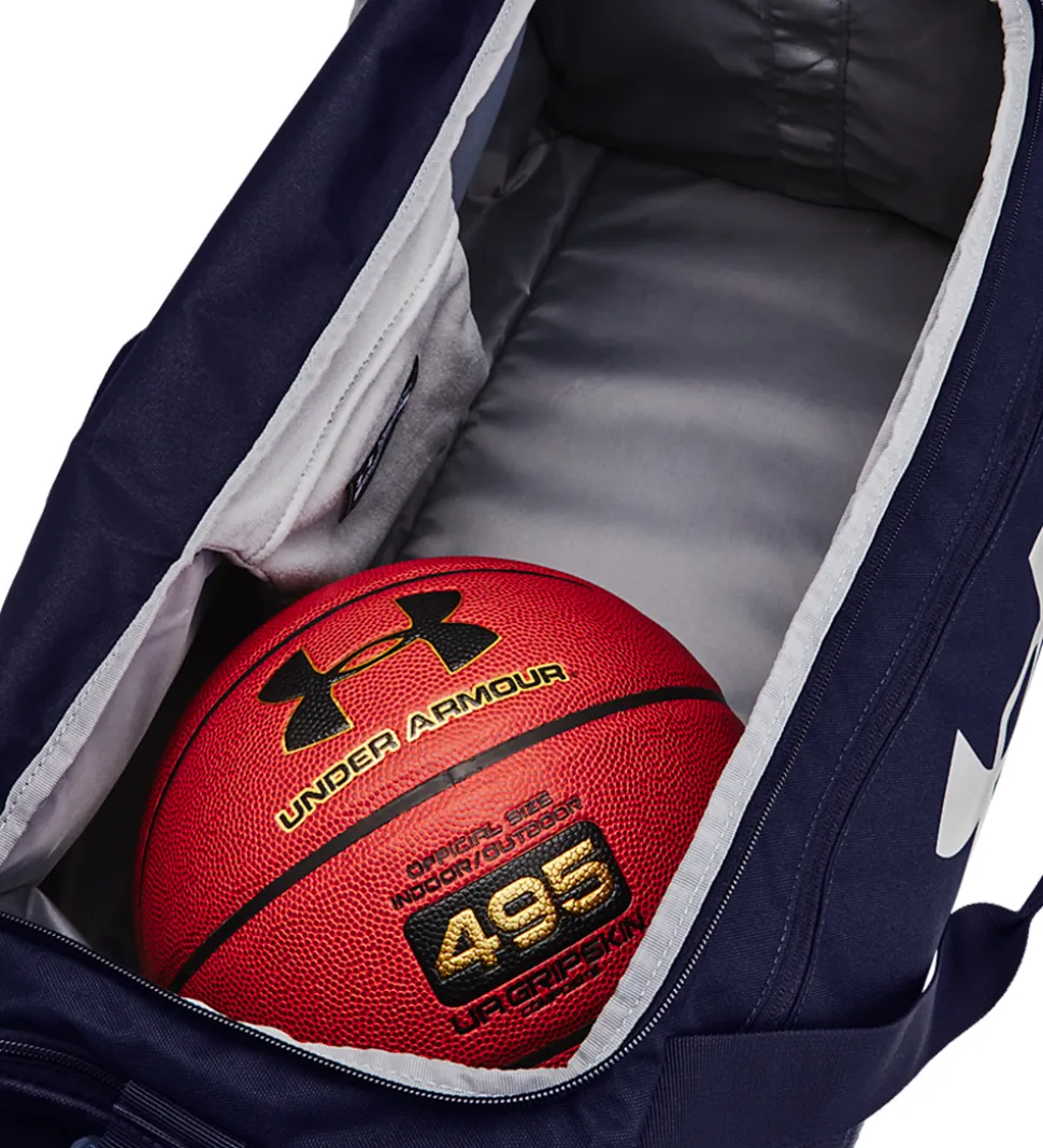 Under Armour sportstasken består af et stort rum, som åbnes på toppen med en dobbelt lynlås. Indvendigt er der en lille forret lomme, til f.eks. en telefon eller lignende. Udenpå er der en lynlåslomme i begge ender, hvor den ene har ekstra god plads til f.eks. sko eller beskidt tøj. I den ene ende er der en stor stiklomme i mesh. På fronten er der en aflang lomme med lynlås.