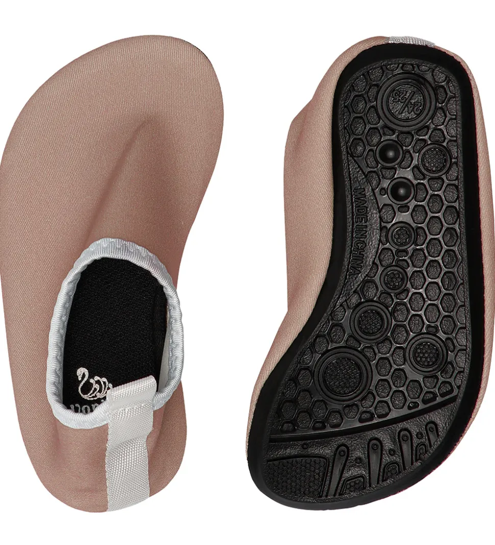 Flotte Vanilla Copenhagen badesko i støvet brun i samme materiale som badetøj og med hvide detaljer.