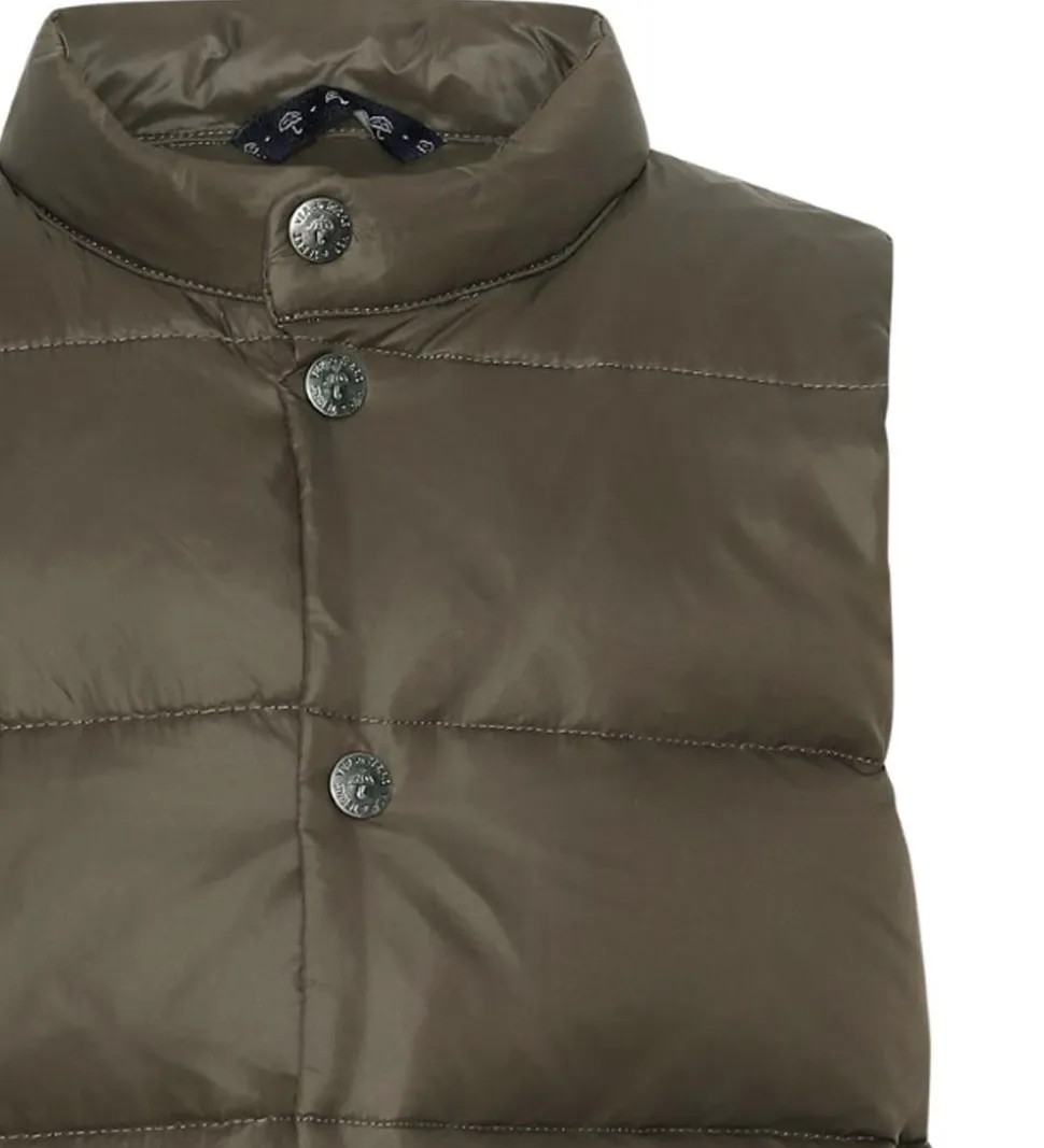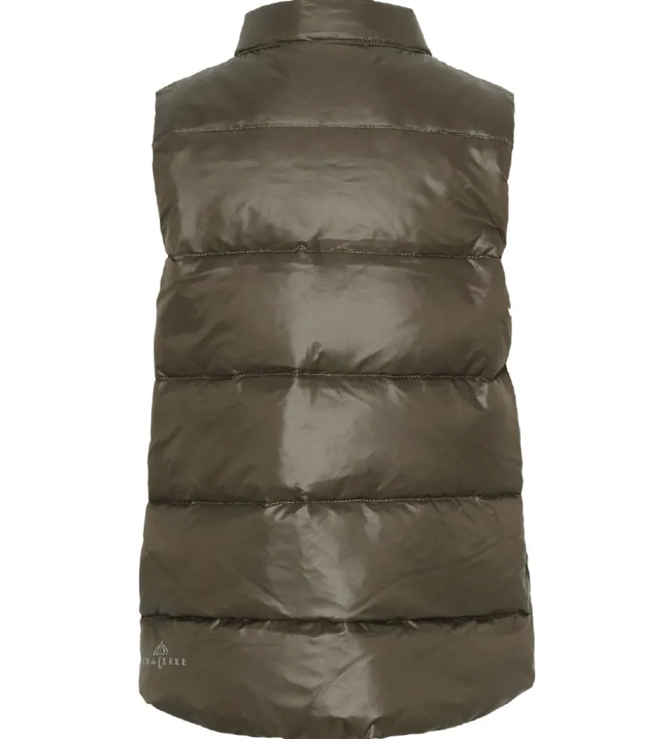 Smart Ver de Terre dunvest i ensfarvet armygrøn. Vesten er lavet i et glatvævet materiale med vandrette syninger, der giver et klassisk dunjakke look.