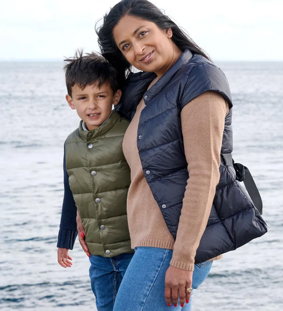 Ver de Terre dunvesten åbnes med mørke metalknapper, og fortil er der to åbne lommer. Vesten er perfekt som ekstra lag på de kølige dage.