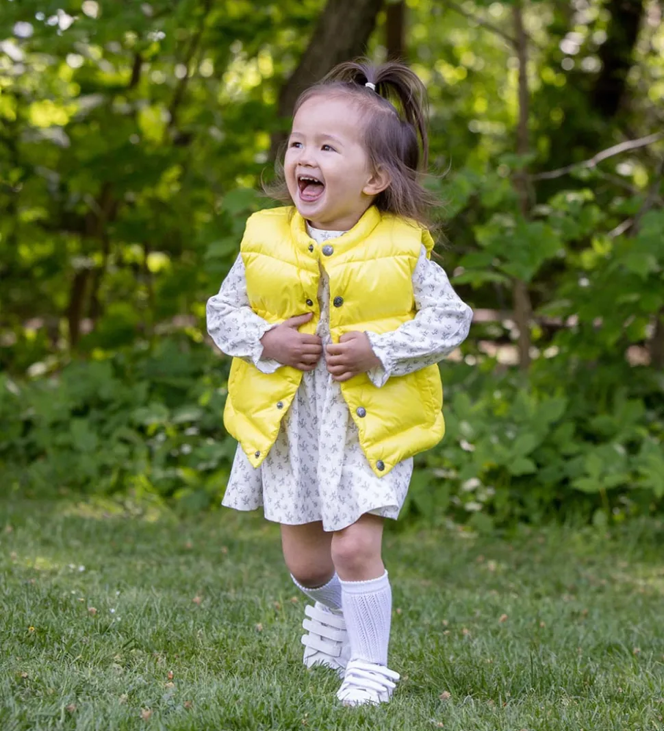 Flot Ver de Terre dunvest i ensfarvet gul. Dunvesten er lavet i et glatvævet materiale med vandrette syninger, der giver et klassisk dunjakke look.