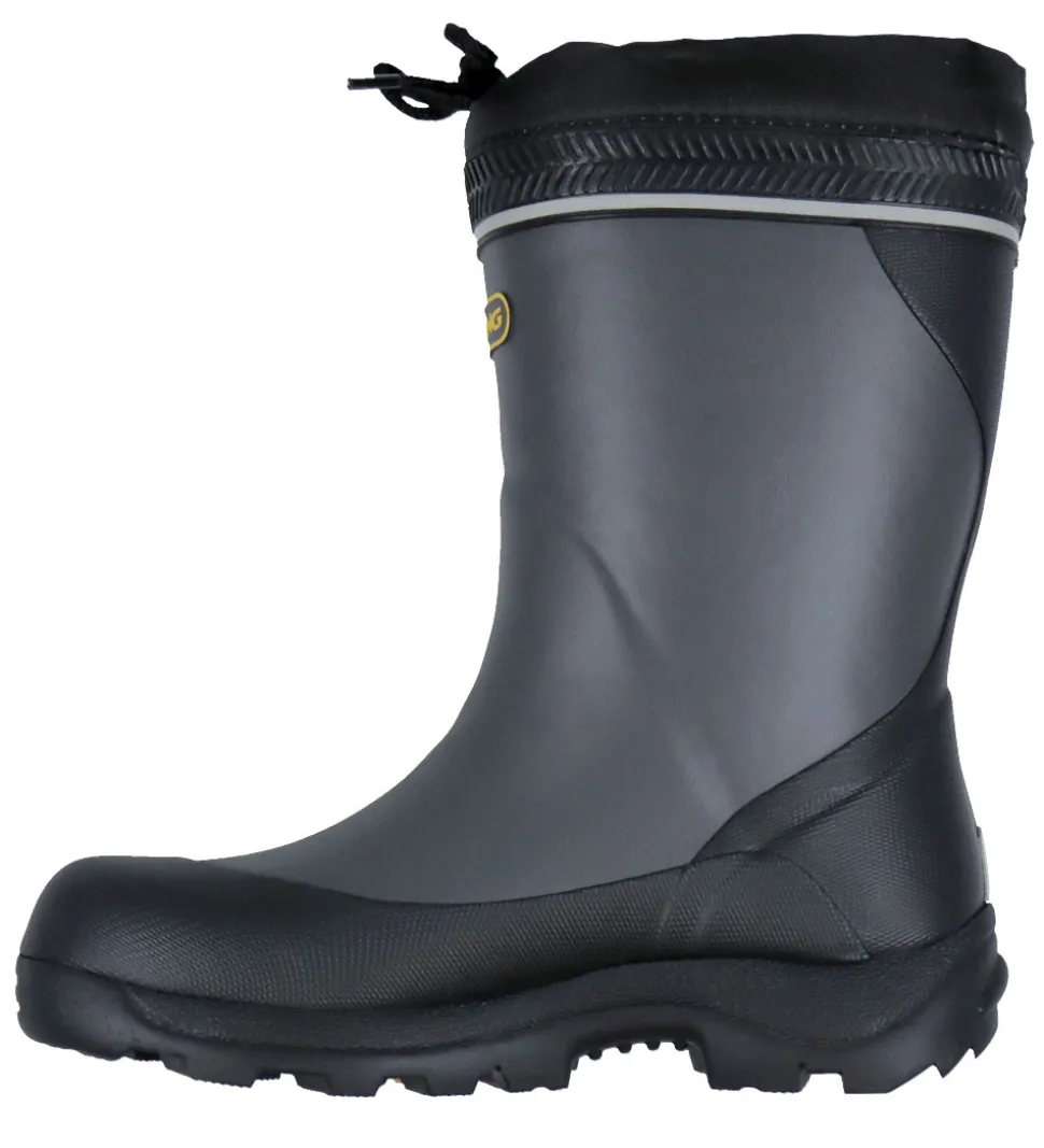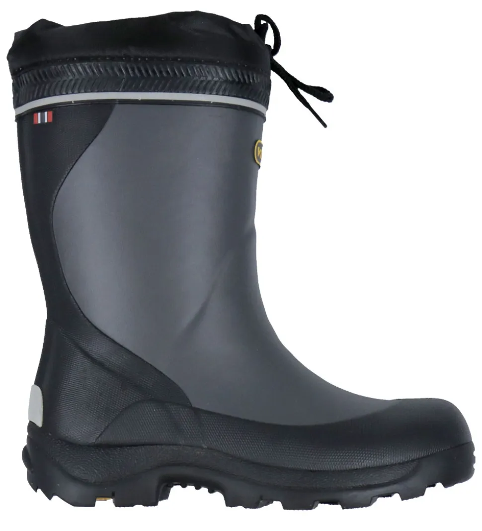 Praktiske Viking termostøvler i mørkegrå og sort naturgummi. Termostøvlerne har et gult logo på fronten af skaftet og en refleksstribe omkring skaftet.