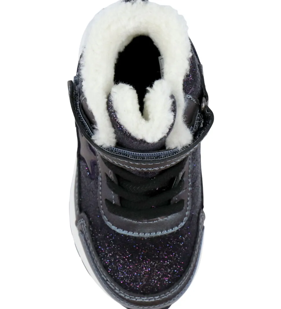Festlige Viking vinterstøvler i metallisk sort med lilla skær og lilla glimmer. På ydersiden er der en stjerne.