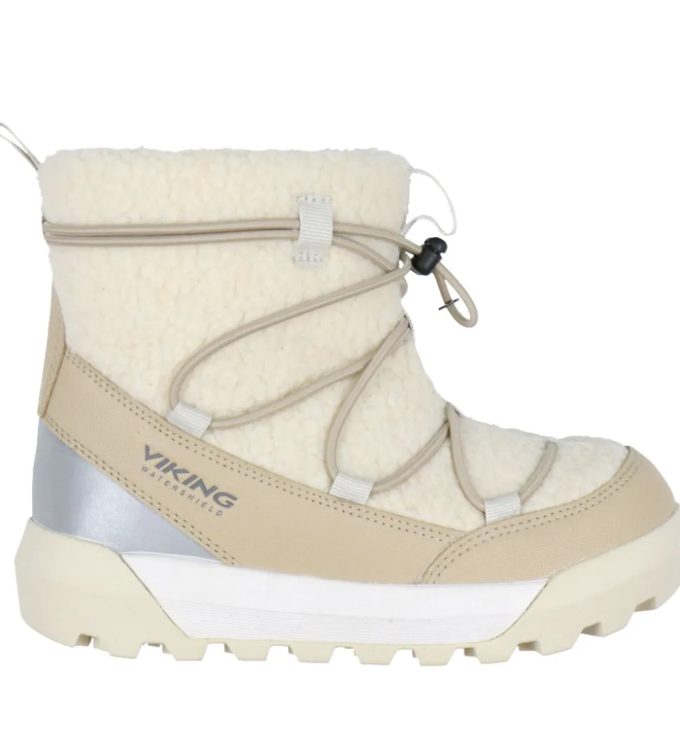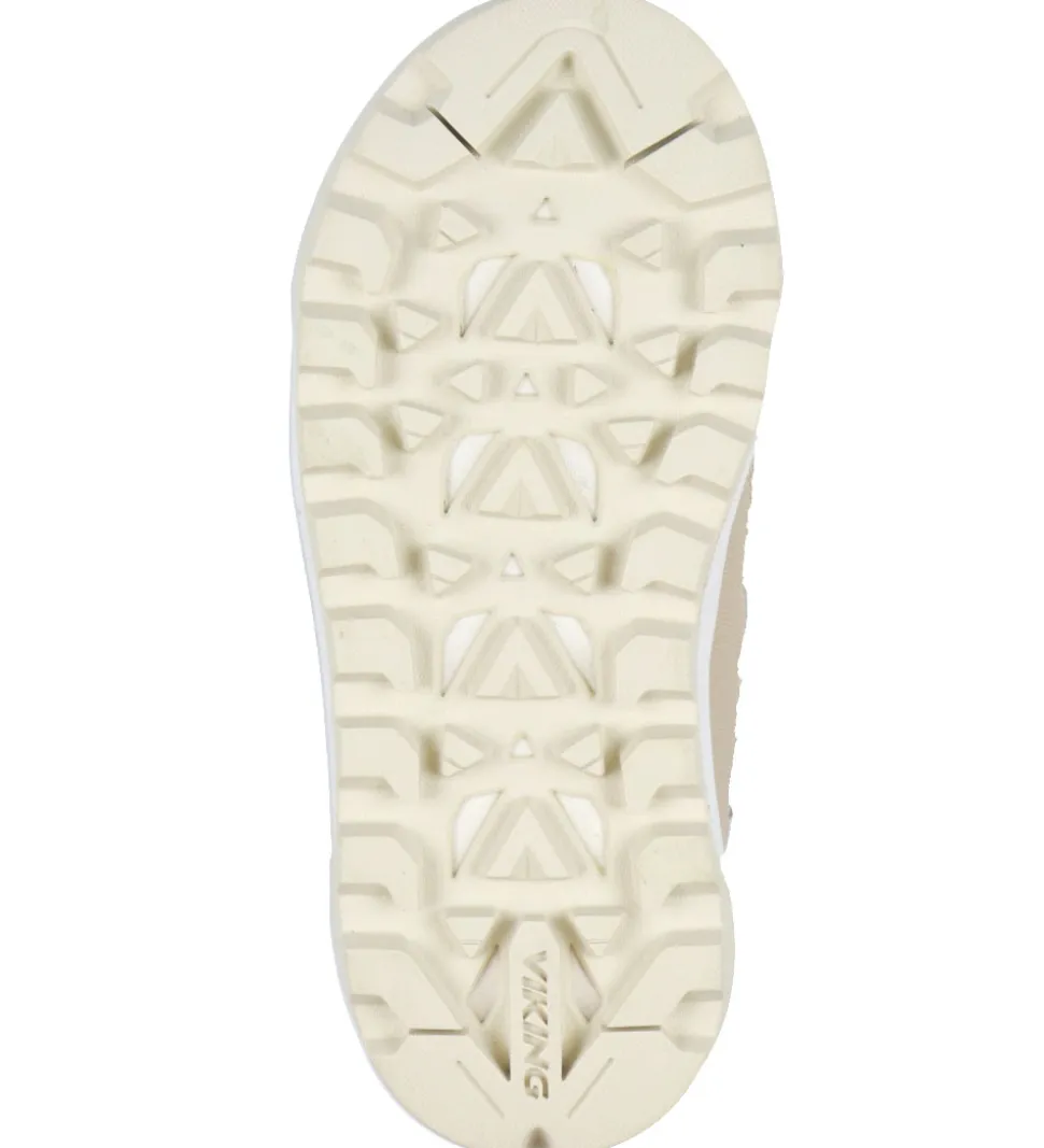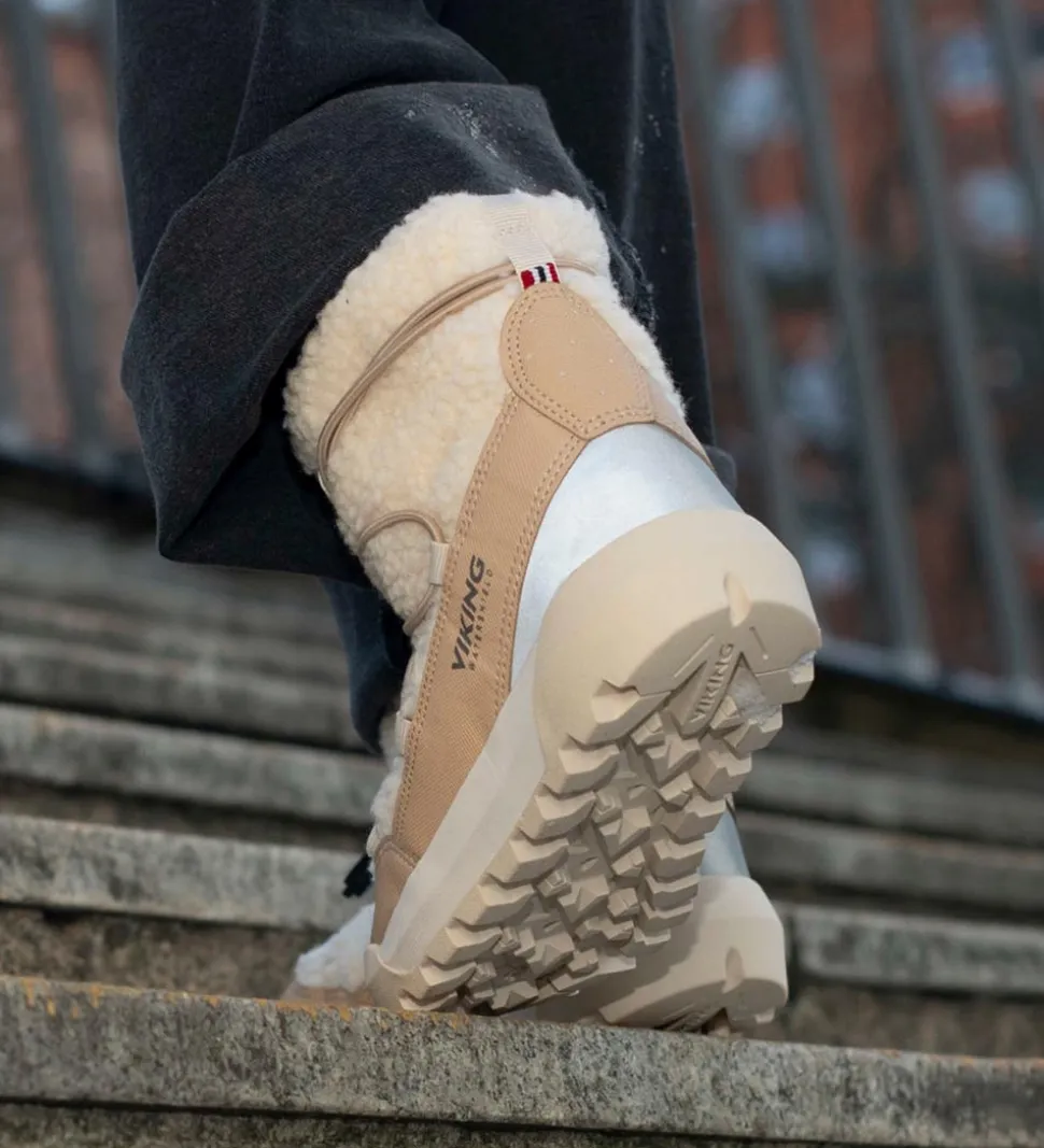 Seje Viking vinterstøvler i beige plysstof og imiteret læder. Vinterstøvlerne har et gråt logo på ydersiden og refleks på hælen.