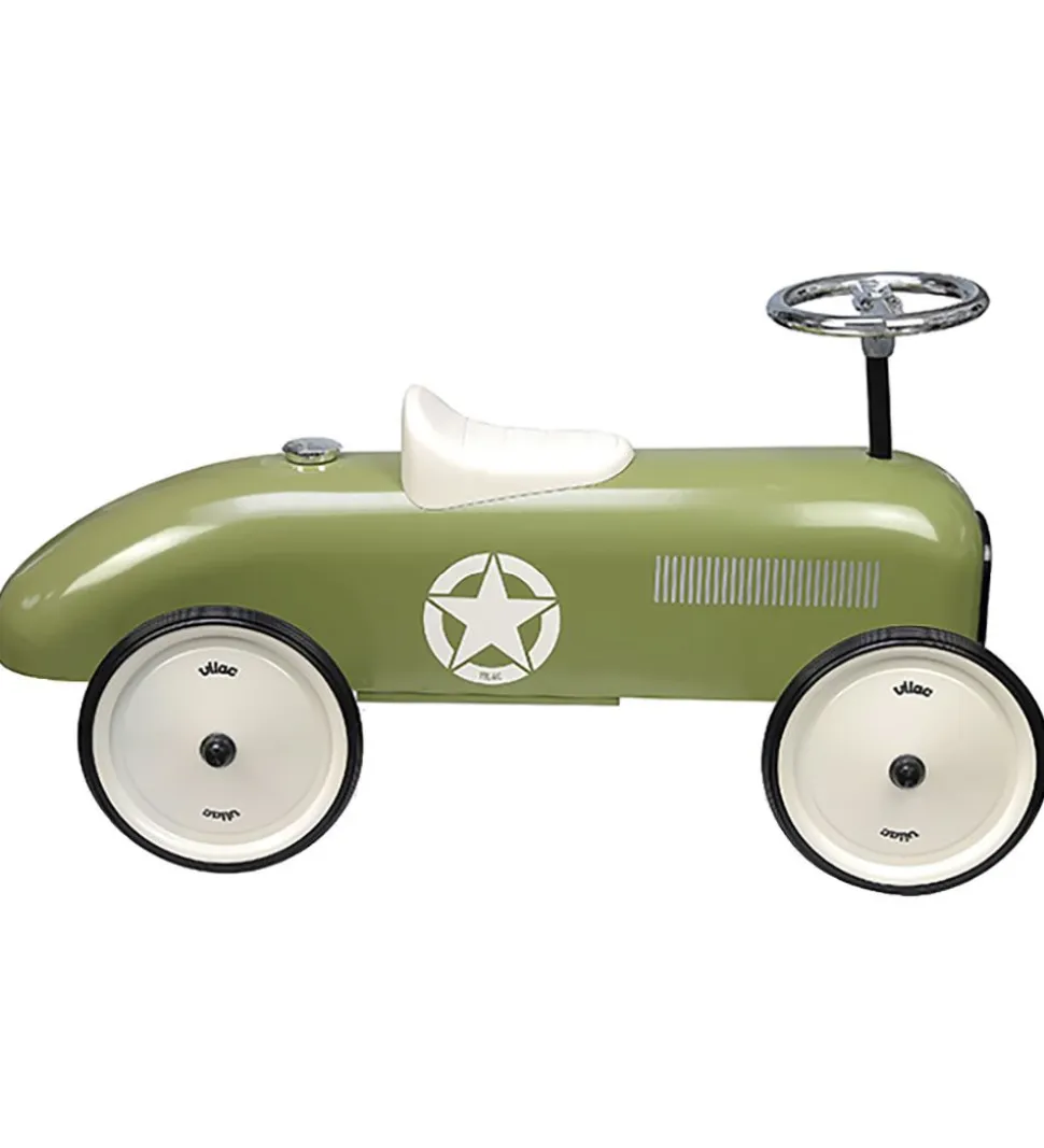 Smuk Vilac gåbil i støvet grøn metal og med et retrodesign som en gammeldags racerbil.