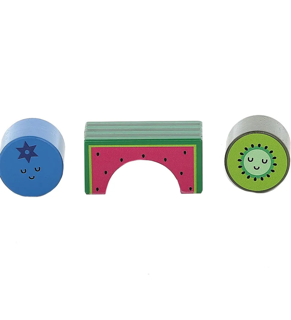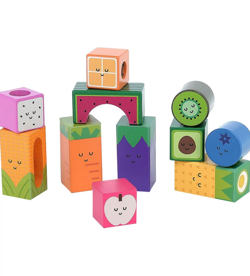 Flotte Vilac klodser i træ i forskellige former med motiver af frugter og grøntsager, med smilende ansigter.
