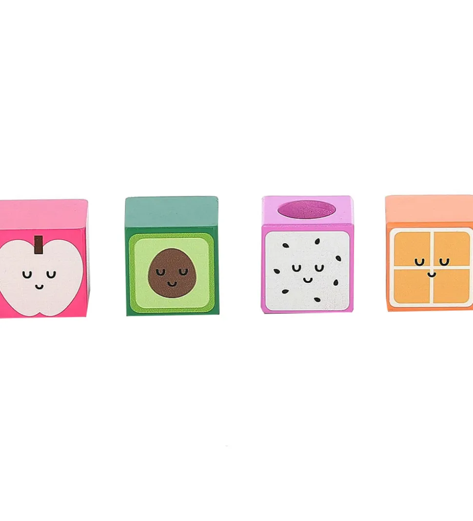 - Fire kvadratiske klodser (avocado, æble, dragefrugt, appelsin)
