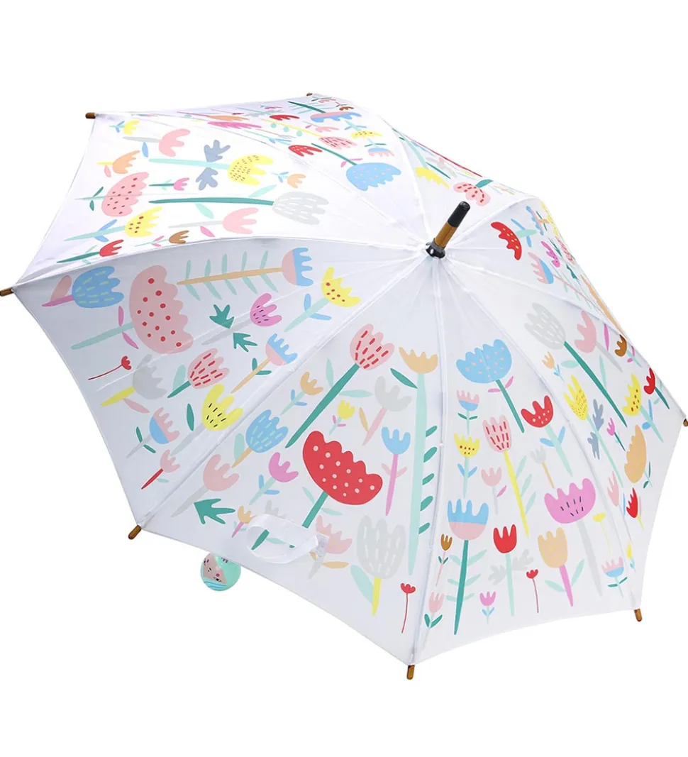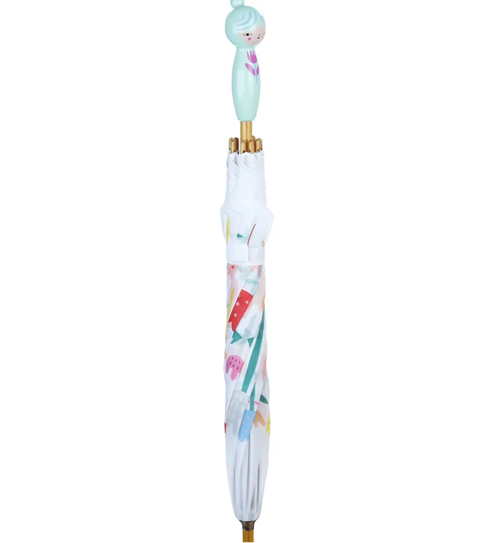 Sød Vilac paraply med en skærm i hvid med et print af multifarvede blomster. Håndtaget er formet som en sød blomsterpige i grøn og rosa, med blå streger.
