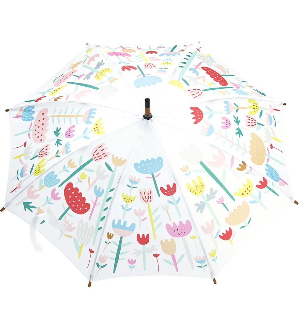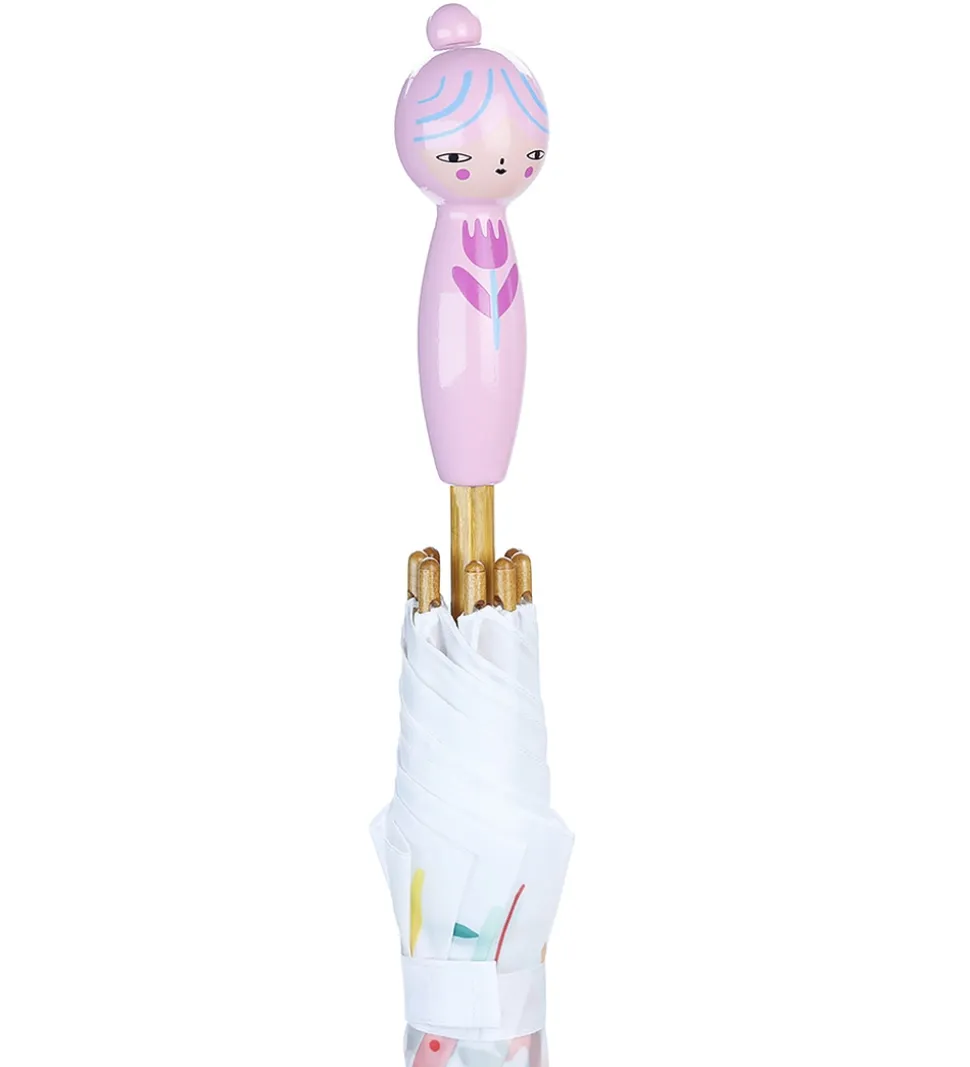 Sød Vilac paraply med en skærm i hvid med et print af multifarvede blomster. Håndtaget er formet som en sød blomsterpige i rosa, med blå streger.