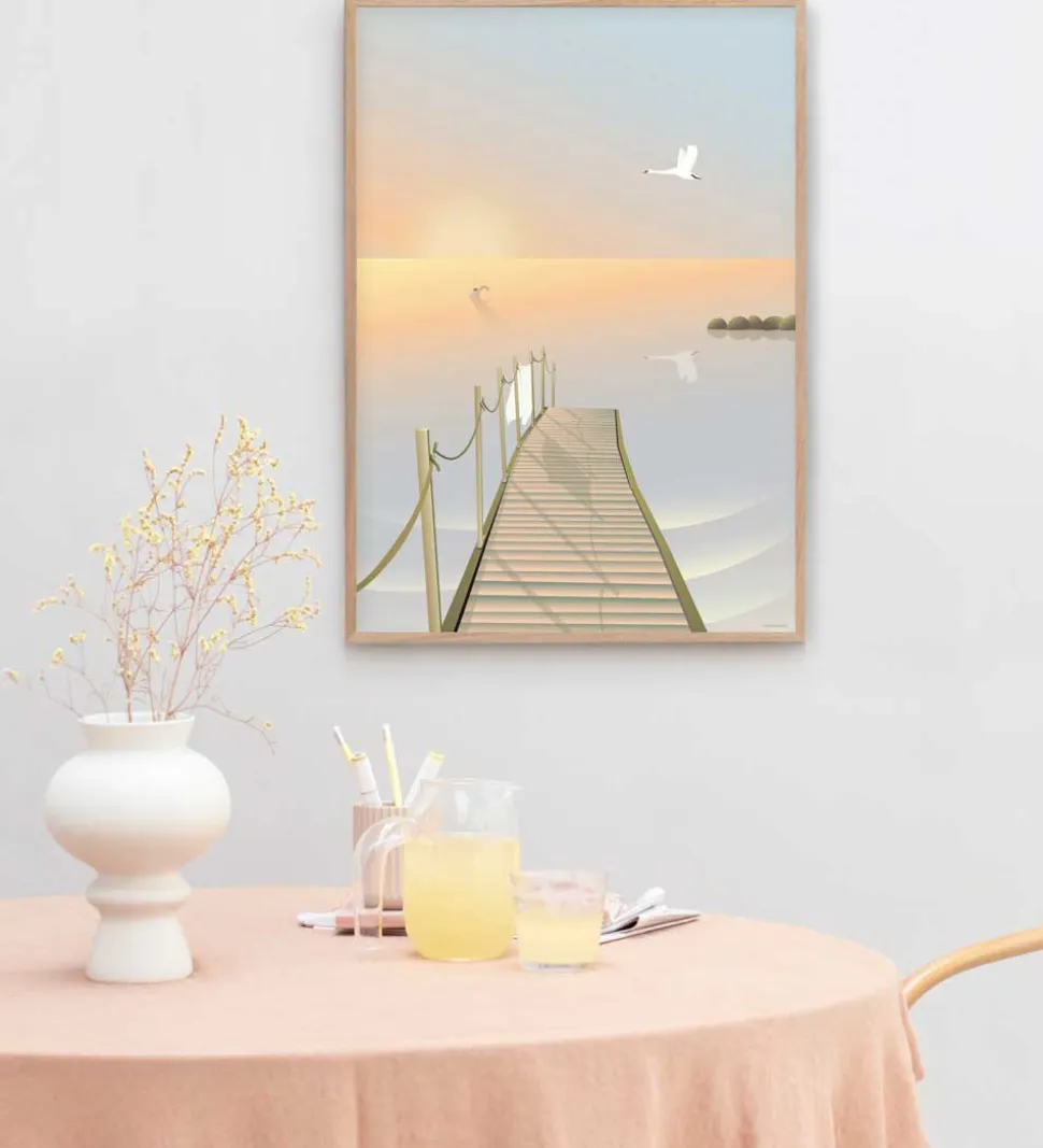 Skøn Vissevasse plakat med et motiv af en badebro og en solopgang i horisonten.