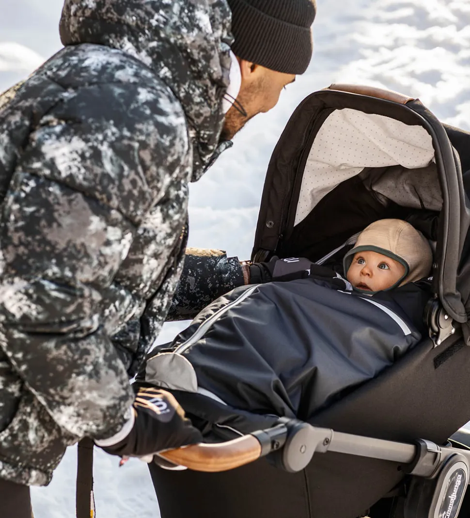 Posen er foret med blødt, lysegråt fleece, og i den øverste del er den vatteret med dun og fjer, mens der i ryggen er et lækkert temperaturregulerende uldfor, som leder fugt væk fra barnets krop, samtidig med at det skaber en stabil og behaglig temeperatur. Fortil og omkring bunden af køreposen er der praktiske reflekser.