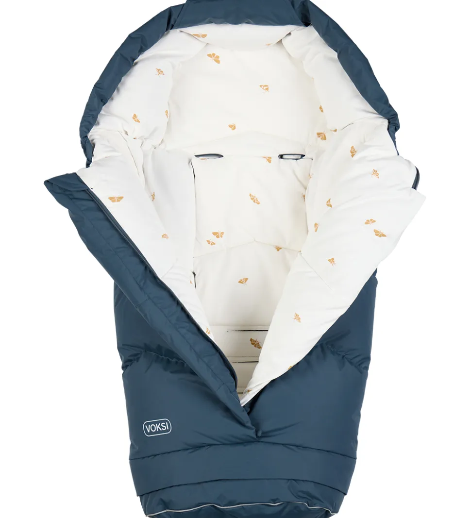 Voksiposen er foret med blødt bomuld, og den er vatteret med lune dun og fjer, mens der er uld i ryggen. Omkring bunden af køreposen er der praktiske reflekser. Der medfølger en flad, let vatteret pude, som nemt kan vaskes, hvis den bliver beskidt.