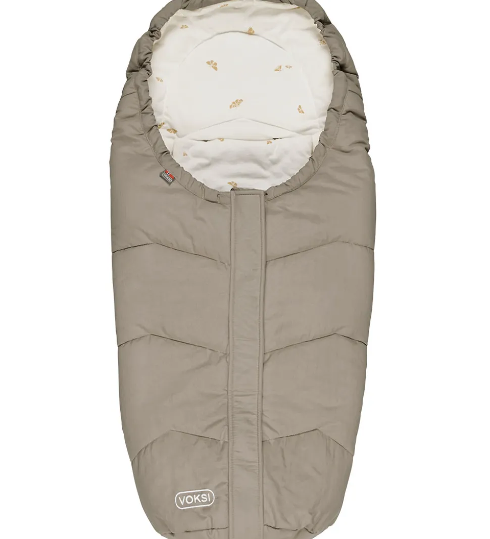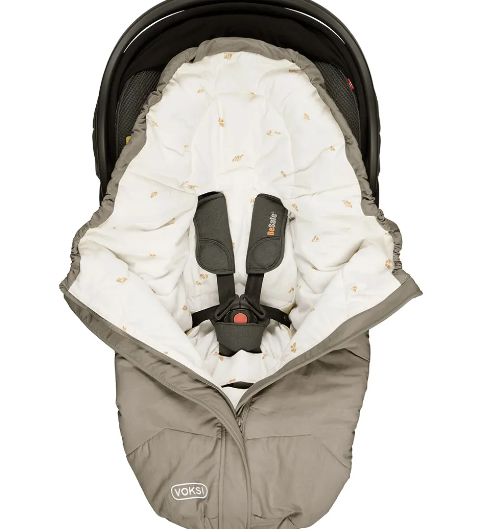 Praktisk Voksi kørepose i modellen Move Light i en mørk, sandfarvet nuance og med et hvidt for med print af små, orange vinger. Denne model egner sig godt til autostole, klapvogne og barnevogne.