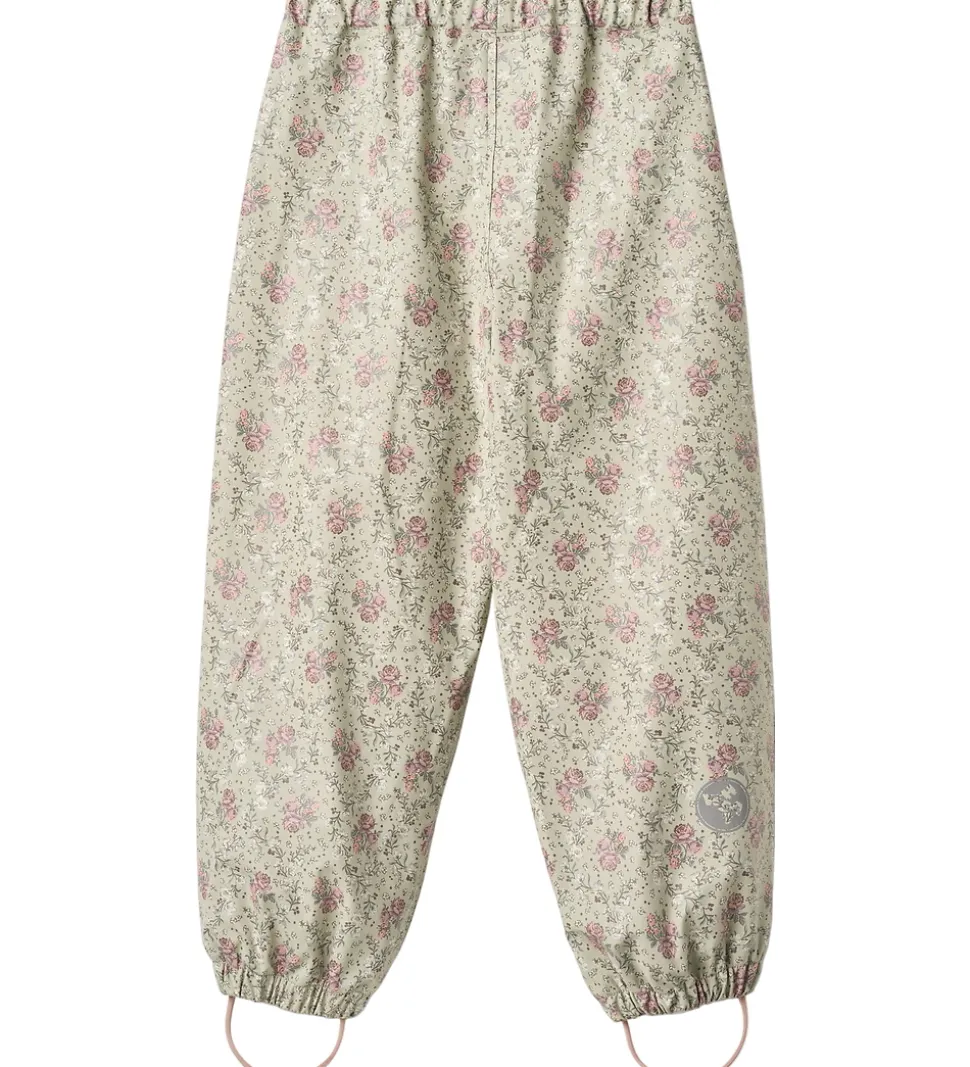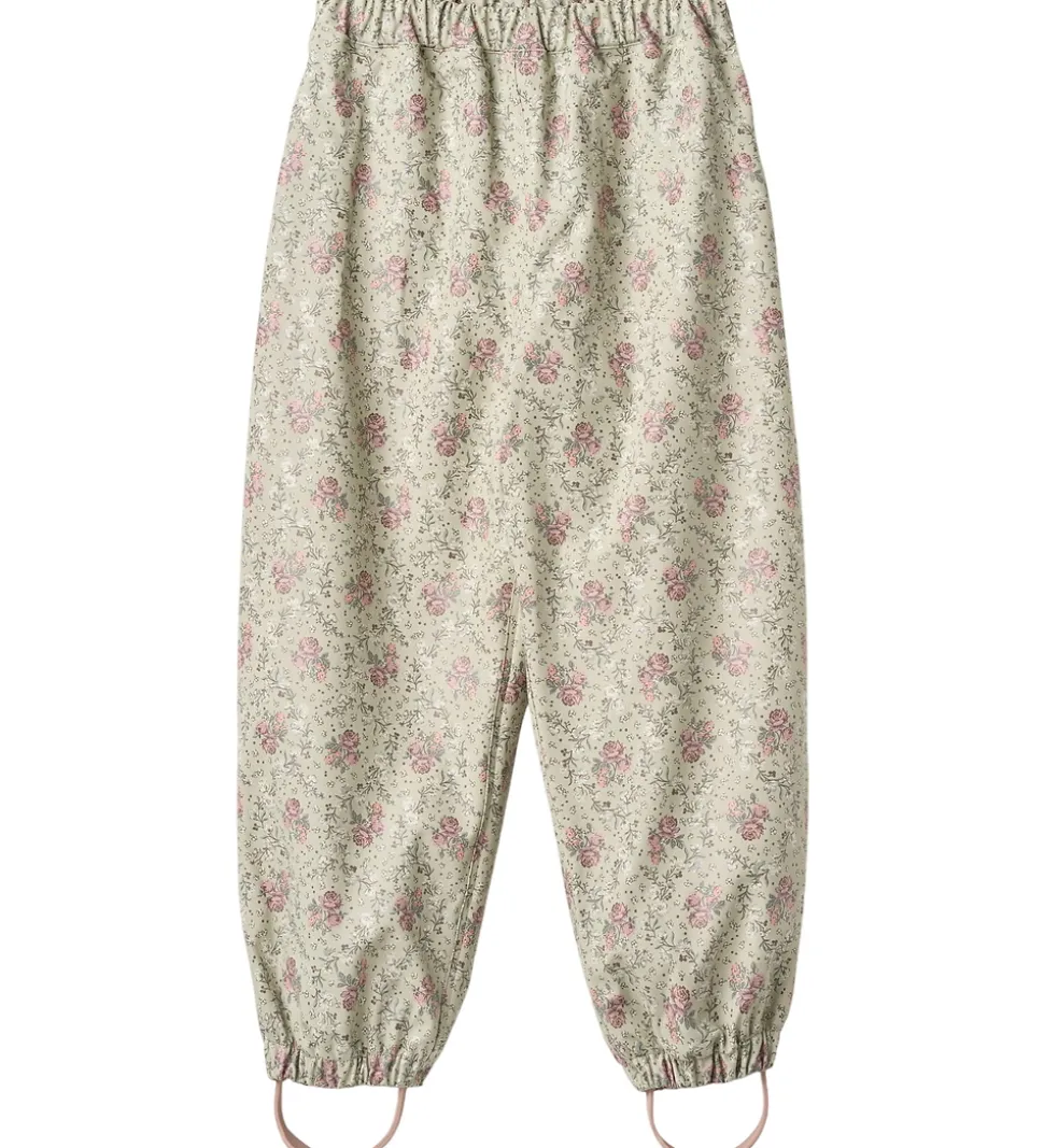 Fine Wheat regnbukser af PU i lys grøm med et blomstret alloverprint i rosa, hvide og grønne nuancer.