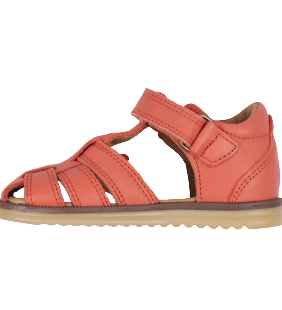 Smarte Wheat sandaler i koralrød skind med en fin blomst på ydersiden.