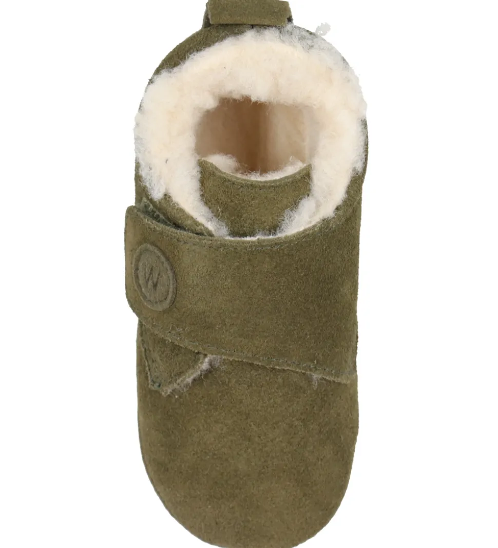 Skønne Wheat skindfutter i støvet grønt ruskind med en fin hælstrop. På pløsen er et logo, og på velcroremmen er der et lædermærke med “W” præget ind i skindet.