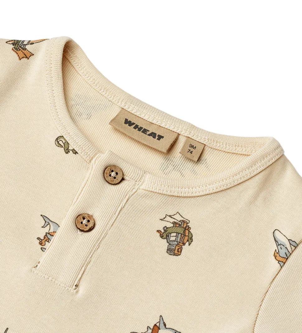 Attraktiv Wheat sommerdragt med korte ærmer i en lys, orange nuance, prydet med et farverigt print af både dyr og robotter på strandmotiver. En perfekt tilføjelse til garderoben fra Wheat.