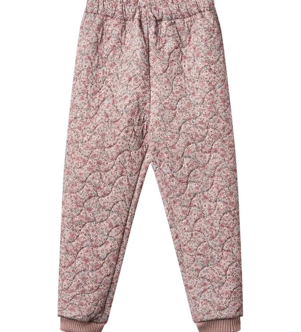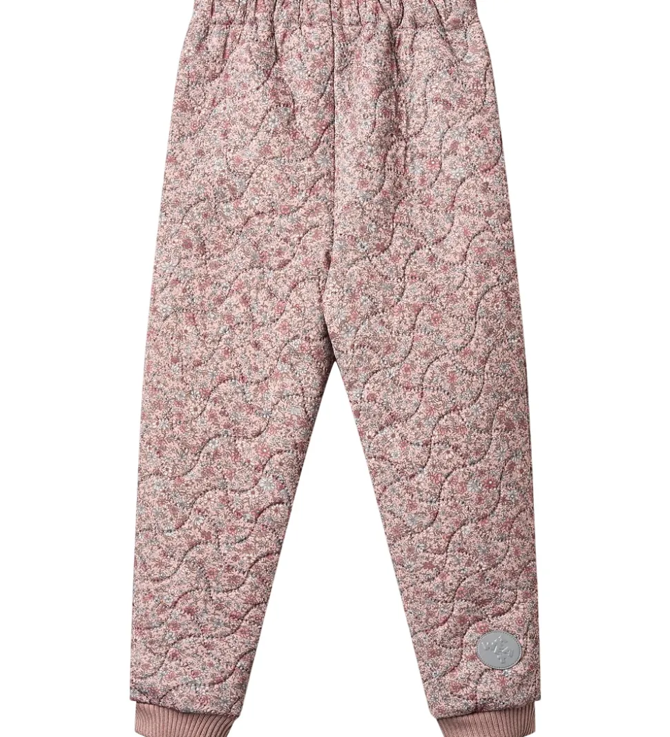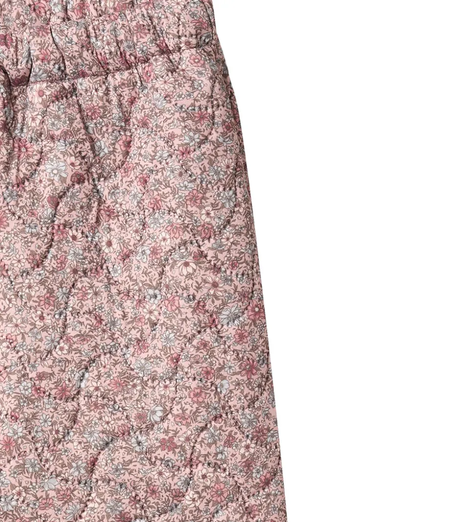 Flotte Wheat termobukser i rosa med et alloverblomsterprint i lyseblå, grønne, hvide og rosa nuancer. Termobukserne har en bølgende, quiltet struktur.