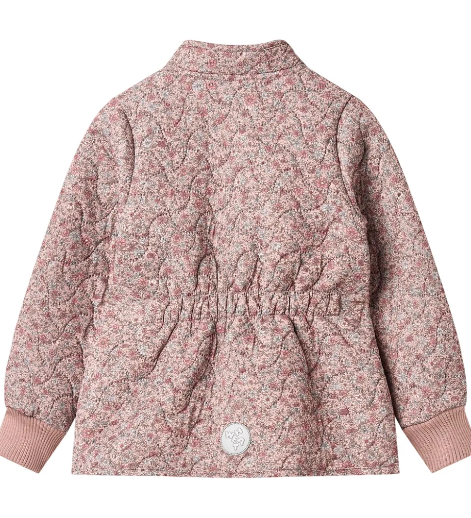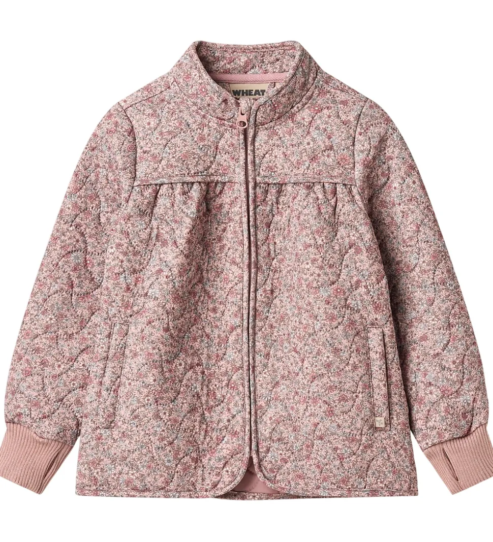 Smuk Wheat termojakke i rosa med et alloverblomsterprint i lyseblå, grønne, hvide og rosa nuancer. Termojakken har en bølgende, quiltet struktur.