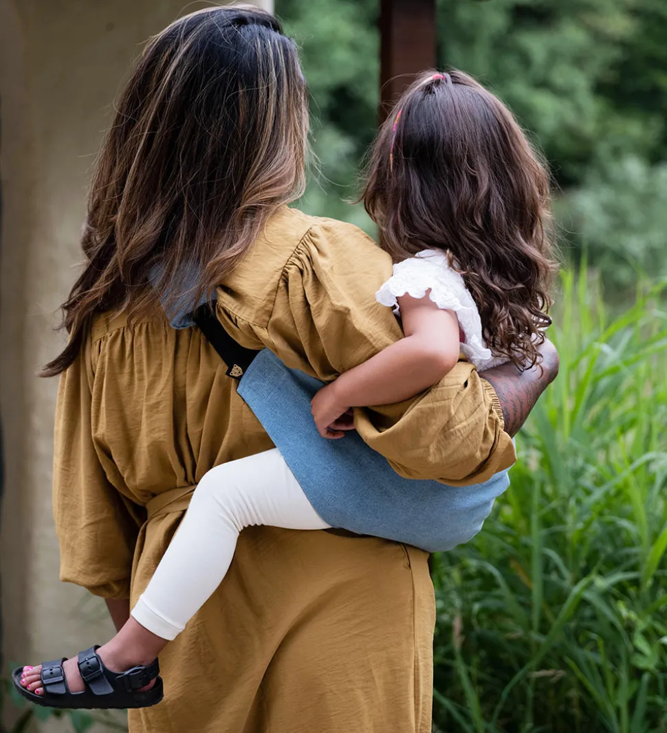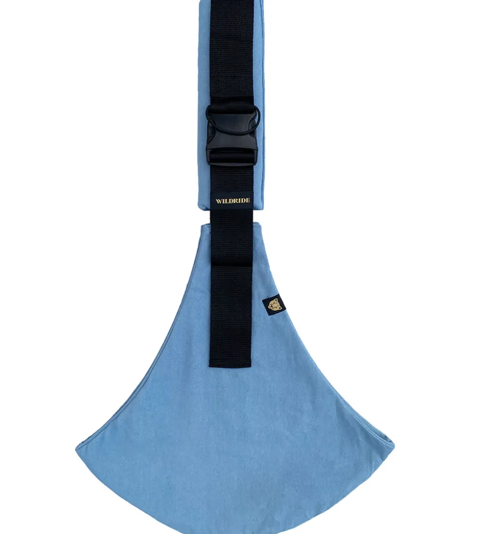 Praktisk Wildride bæresele i lyseblå denim med tre små, påsyede loger i sort og brun.