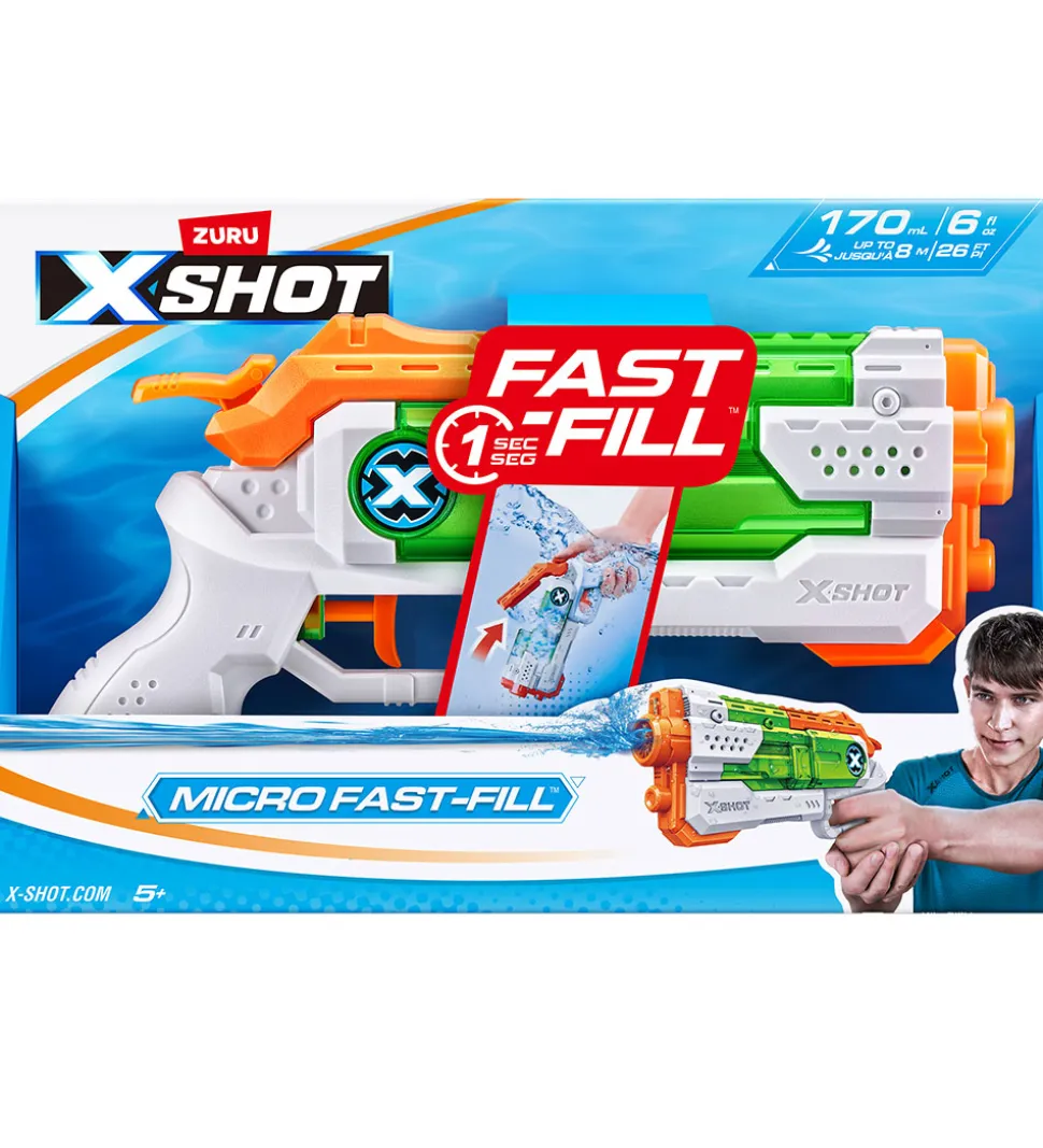 X-SHOT vandpistolen er perfekt til hæsblæsende og afkølende vandkamp, da den har Fast Fill-funktion, så den kan blive fyldt med vand på 1 sekund. Vandpistolen sprøjter vand op til 8 meter.